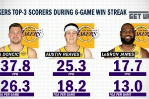 里夫斯6连胜期间场均出手18.2次,场均砍25.3分
