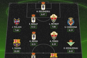 体育资讯4月14日讯 西甲第31轮战罢,数据网站Whoscored也评选出本轮比赛评分最高阵容,其中亚马尔满分10分领衔,具体如下: