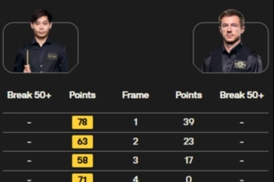 全场比赛,贺国强打出1杆破百和1杆50+,利索夫斯基打出4杆50+。