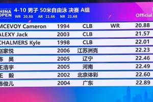 体育资讯03月20日讯 中国游泳公开赛男子50米自由泳A组决赛,31岁的澳大利亚选手卡梅伦·麦克沃伊游出20秒88,打破世界纪录夺金。杰克·阿莱克西21秒57夺得银牌,凯尔·查尔默斯22秒01夺得铜牌。